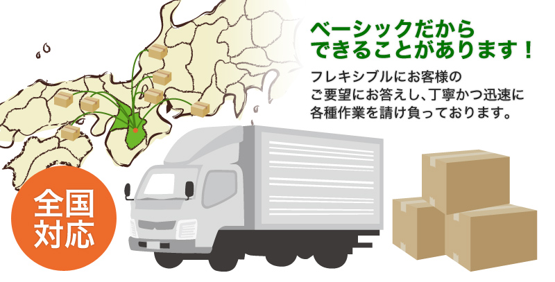 ベーシックでは、一つの商品の組み立て製造、保管、物流までをトータルに実現できる体制が整っております。グループで約6,000坪のスペースがある倉庫に入庫して頂き、納期まで保管と在庫管理をしっかり行います。出庫の際は、全国輸送ネットワークがありますので、コストを大幅に低減できます!